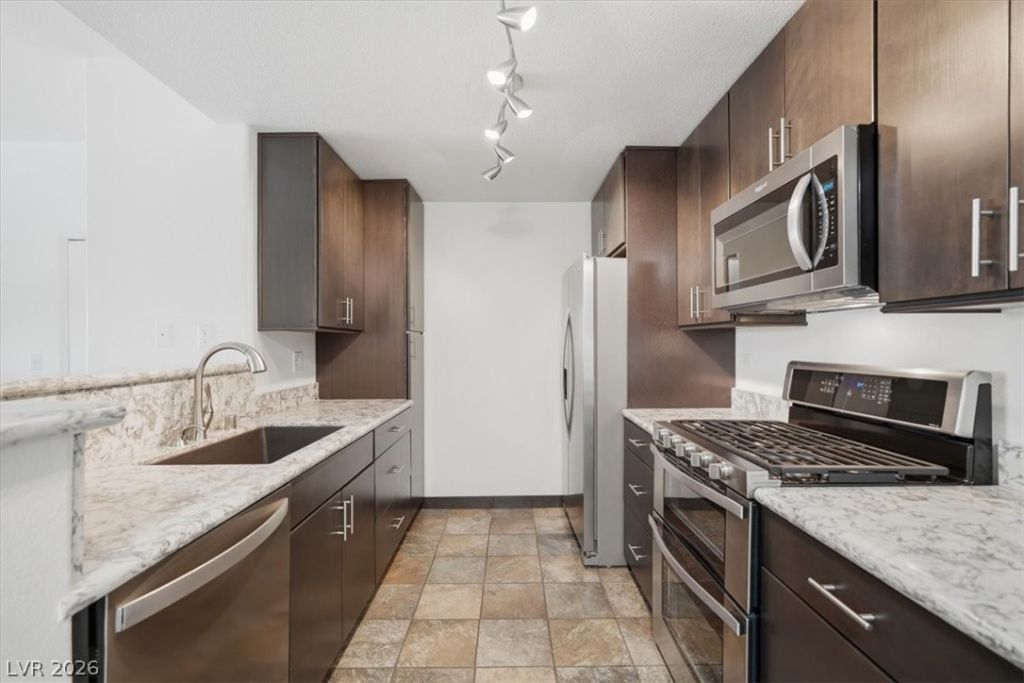 READY NOW! Move in ready, gated 2 bedroom condo located across the street from Skye Canyon Master Planned Community. Community features exercise room, meeting area, resort style pool / spa with waterfall and outdoor shower. Located minutes from the 95 Freeway this unit has plenty of natural light, tile / carpet floors, FULLY RENOVATED KITCHEN, stainless steel appliances, dual oven stove, quartz counters, extended full height cabinets, ceiling fans, blinds and plenty of storage. Washer and dryer included, family room opens up to an expansive balcony with tile floors and storage closet. Primary has a huge walk in closet, tub / shower combo and newer toilet. 2nd bedroom is oversized with large walk in closet. Extremely well maintained and located near the community facilities.